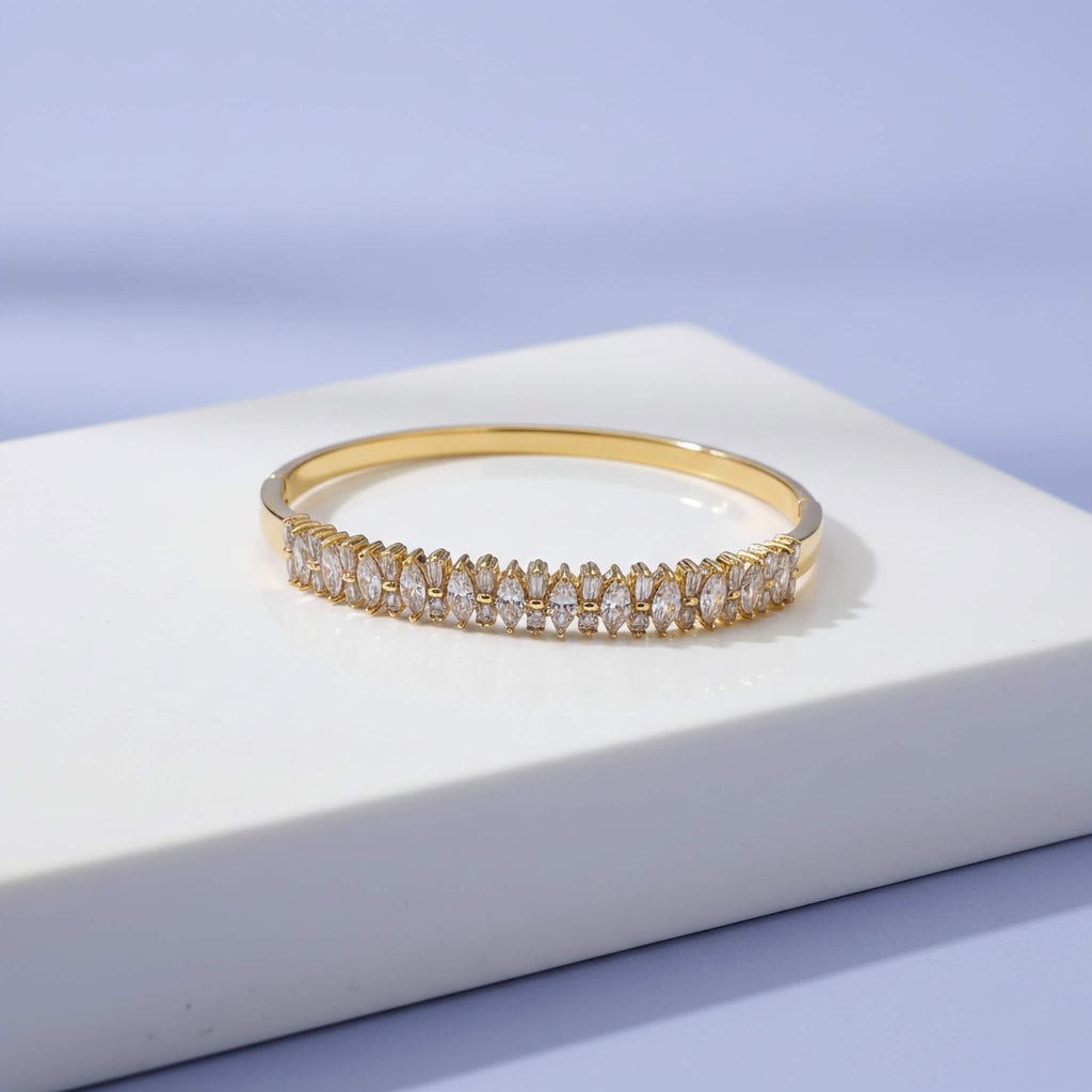 Try  LeDeSaRa's Celestial Spark Bangle | Luxury Gold Plated Jewelry for Everyday Glam, a masterpiece of elegance and light. This stunning 18K gold-plated bangle features a row of marquise-cut zirconia diamonds that shimmer like a stars. a perfect jewelry for both daily wear and special occasions.